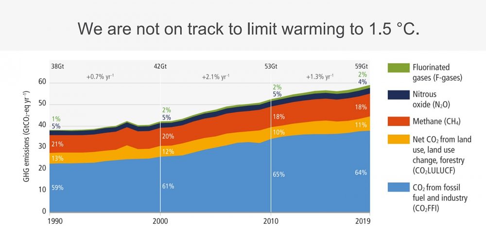 - Celkové antropogénne emisie skleníkových plynov počas obdobia 2010 – 2019 naďalej rástli, rovnako ako kumulatívne emisie CO2 od roku 1850. Priemerné ročné emisie skleníkových plynov počas rokov 2010 – 2019 boli vyššie ako v ktoromkoľvek predchádzajúcom desaťročí.